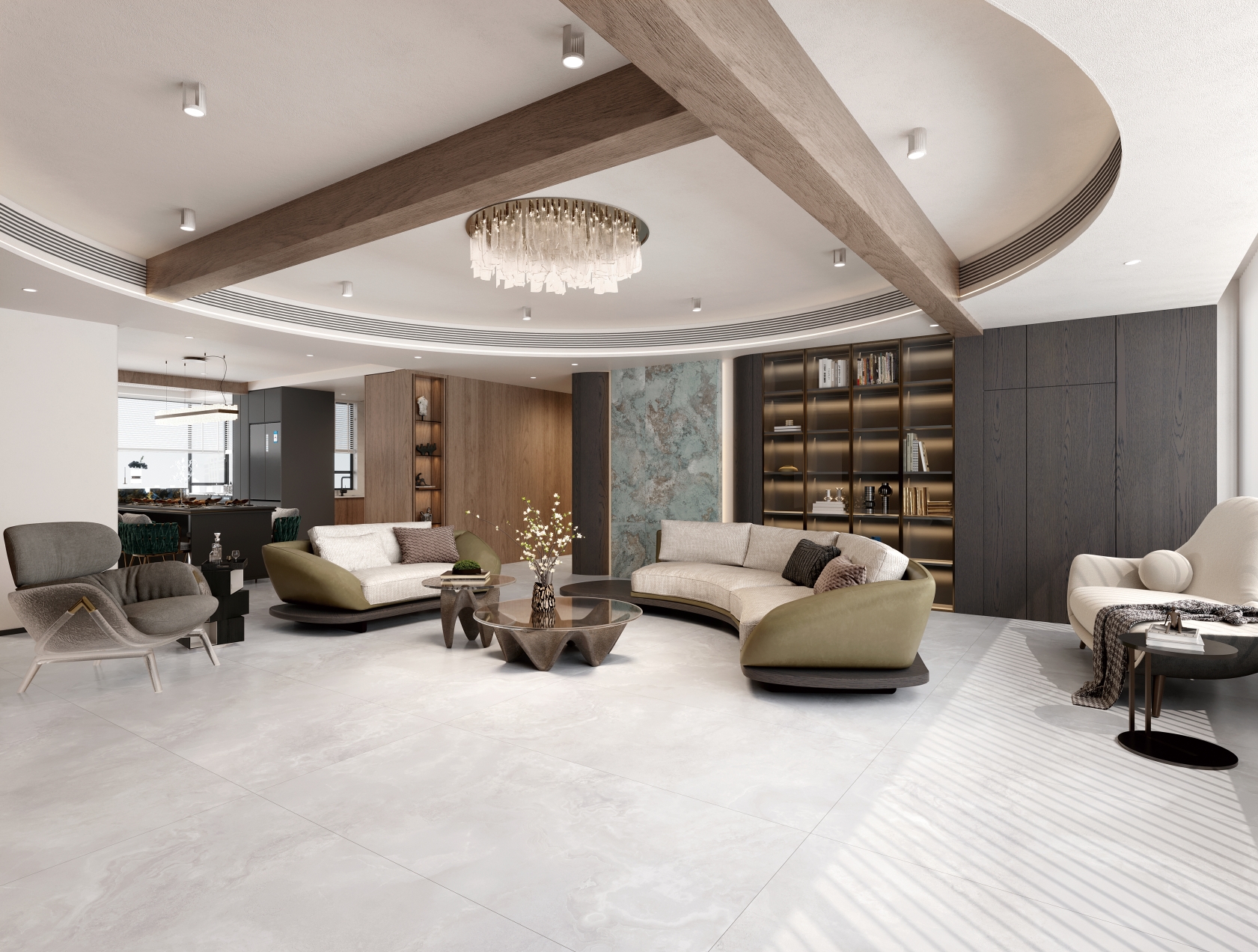 自然通透細(xì)膩,灰色線條、肆意飄散的紋理,深淺變化不一縱情延伸, 在空間里獨(dú)自綻放光彩,營(yíng)造了獨(dú)特隨性的空間氛圍。