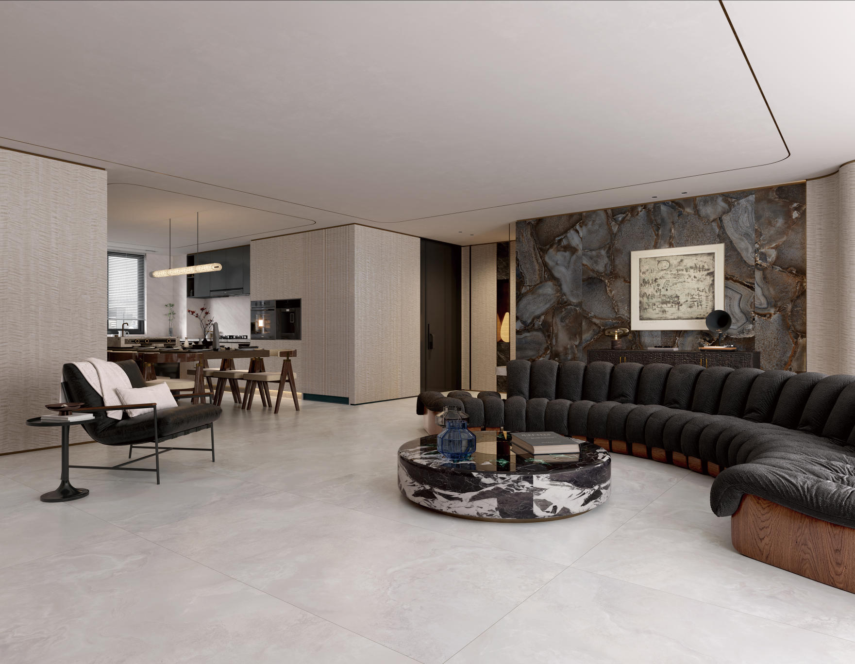 自然通透細膩,灰色線條、肆意飄散的紋理,深淺變化不一縱情延伸, 在空間里獨自綻放光彩,營造了獨特隨性的空間氛圍。