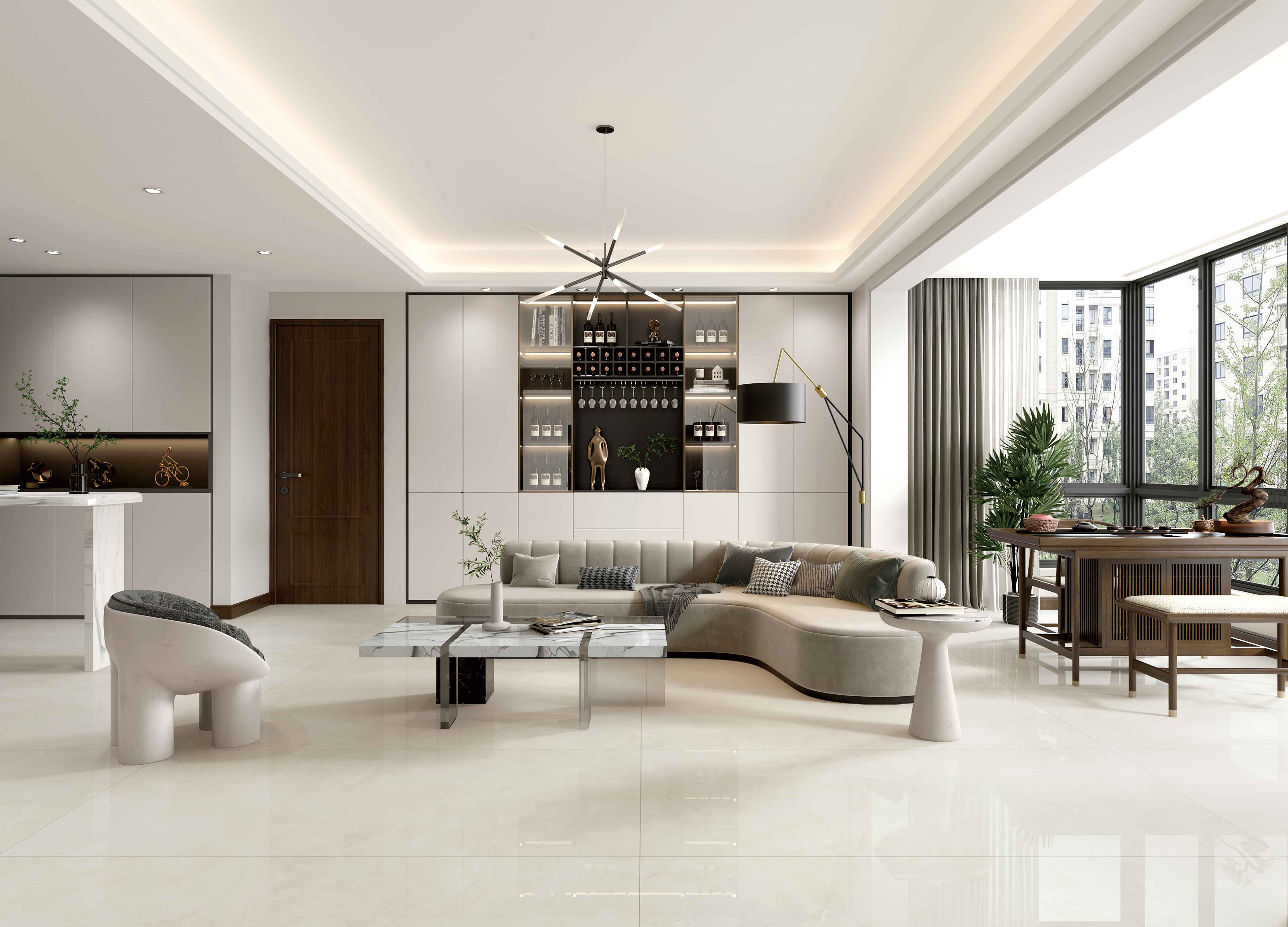 柔和、溫暖的淺米色調(diào),白色線(xiàn)紋點(diǎn)綴其中,像星光劃過(guò),與暖色的背影相得益彰,呈現(xiàn)純粹干凈之感,打造現(xiàn)代極簡(jiǎn)靜謐,高雅溫和的空間。